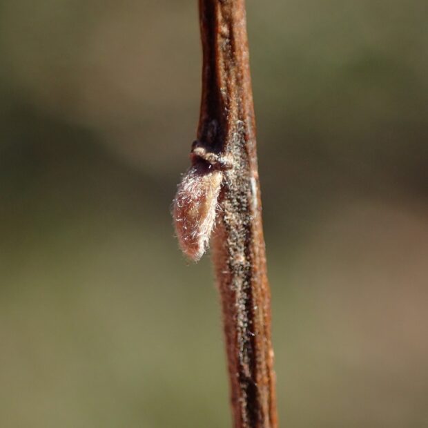 実は卵形で5月に熟して裂けるように開き、 中から白い綿毛のついた種が飛び出します。 日本では雌木が少ないため、 あまり見られません。