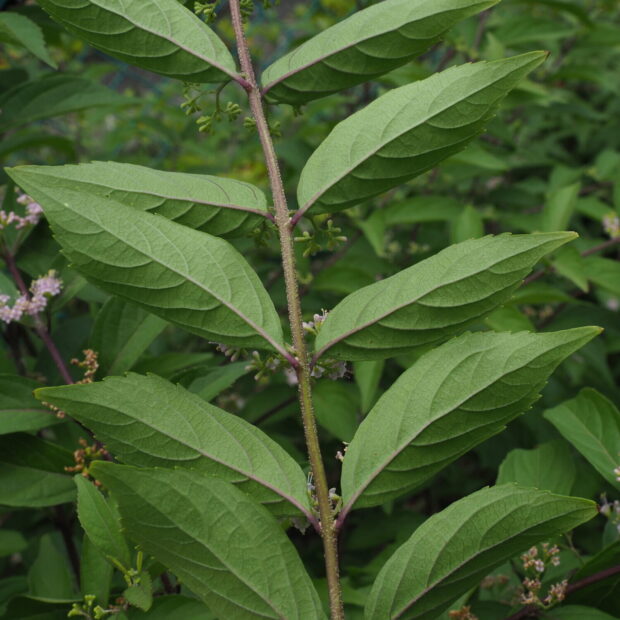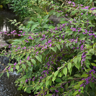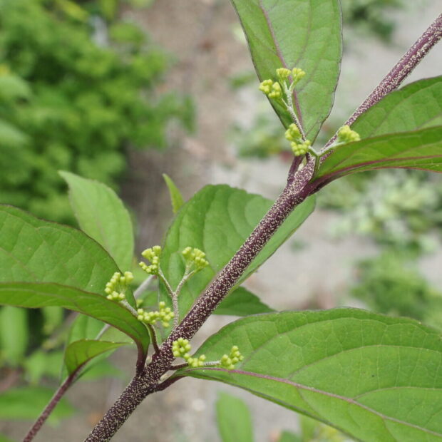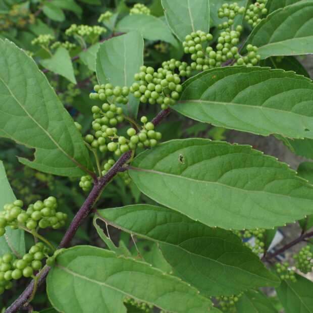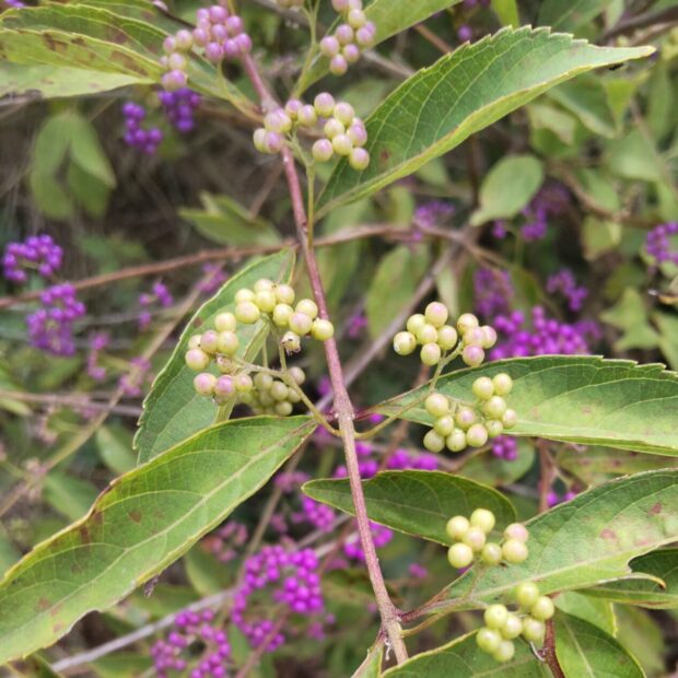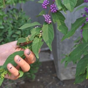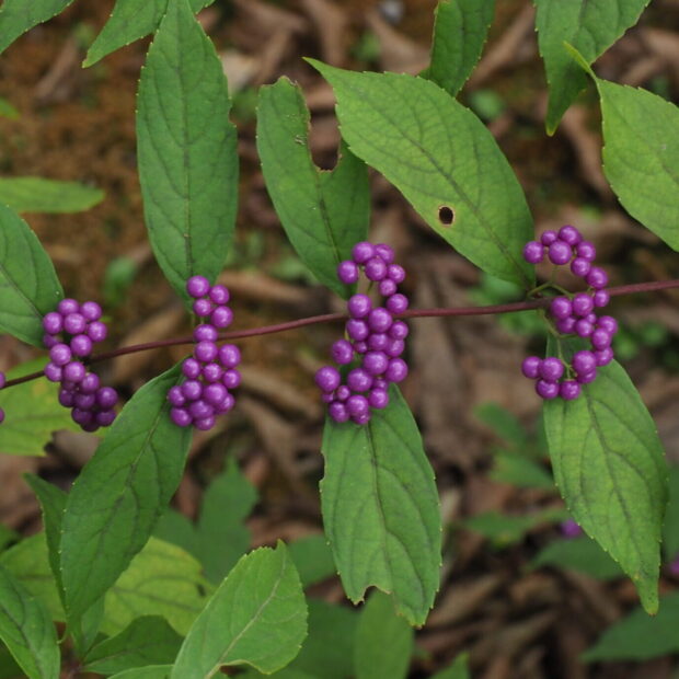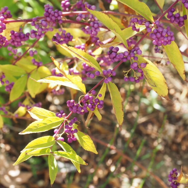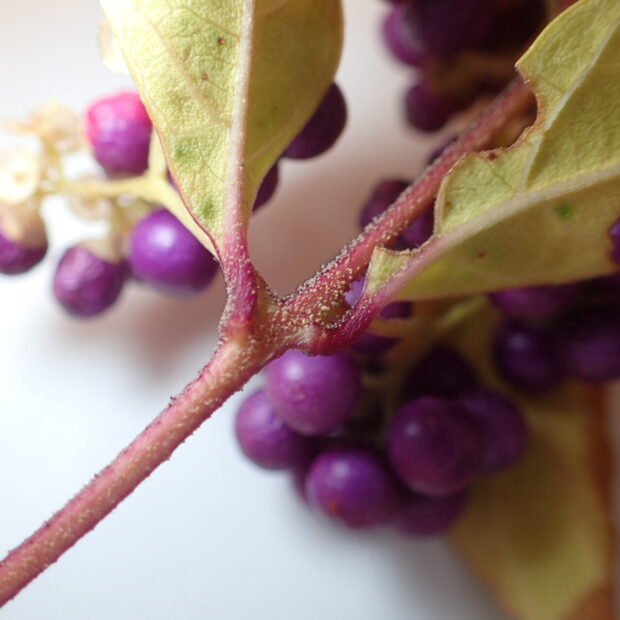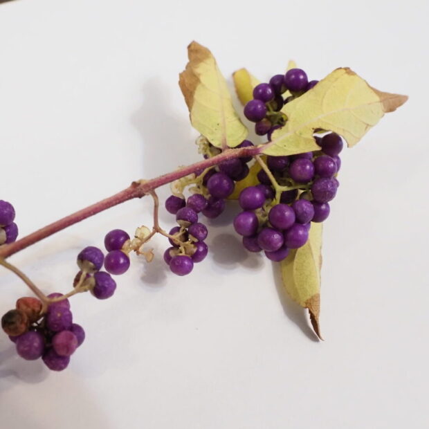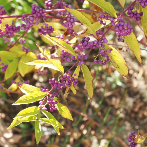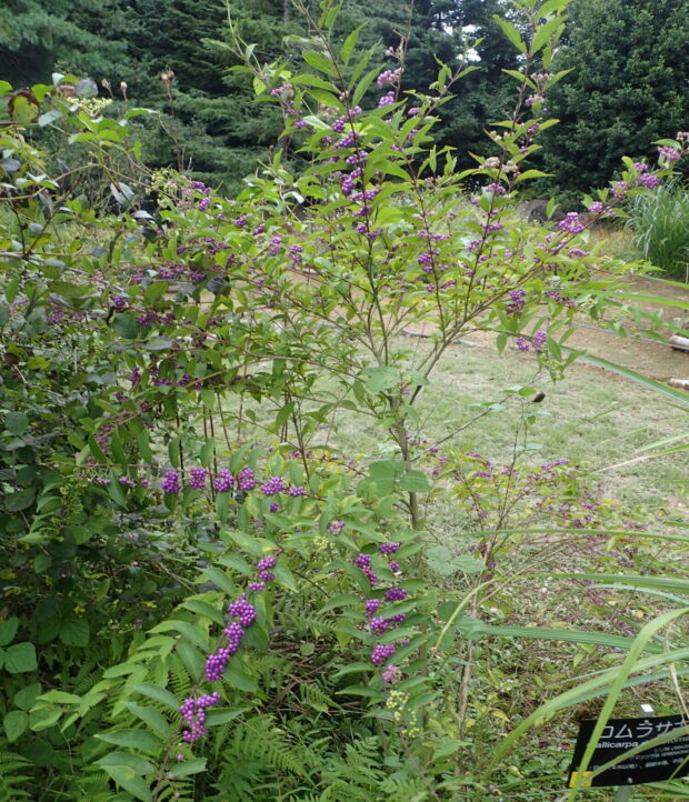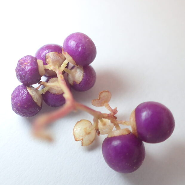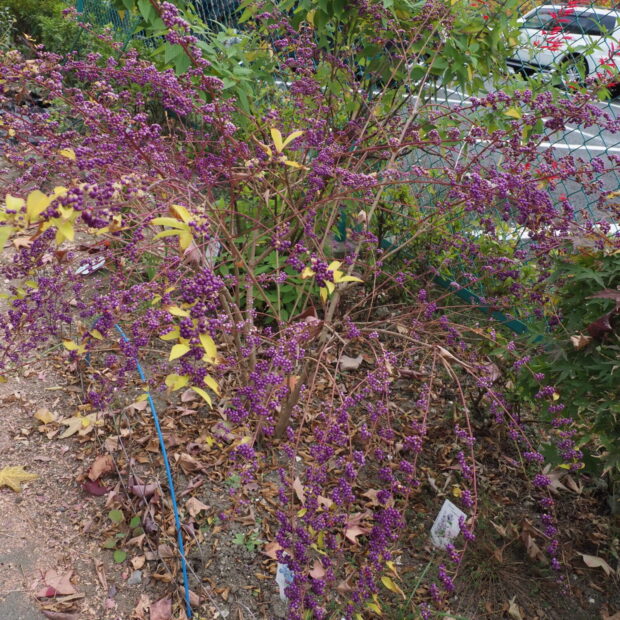10月ごろに直径3㎜ほどの可愛らしい紫色の実をた~くさん付けます。 葉が散った後も残るのでとても目立ちます。 白い実をつける種類もあります。