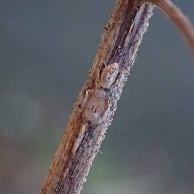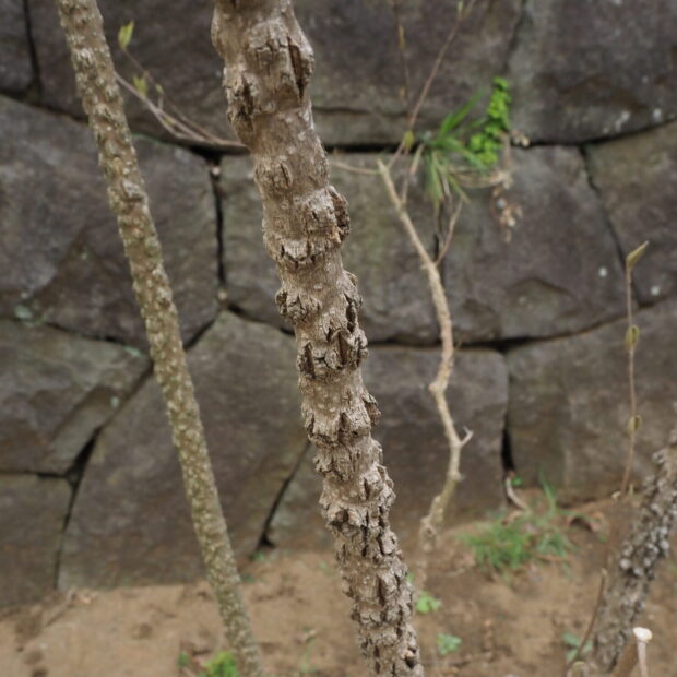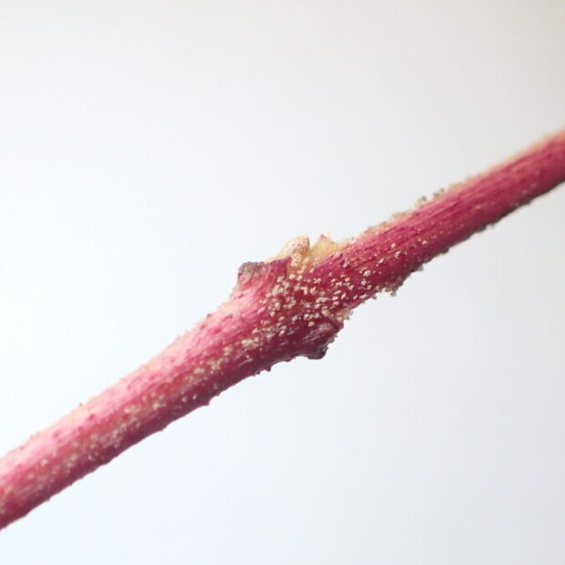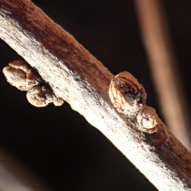 葉痕のすぐ上に、 コロッとした丸い冬芽が付きます。 枝先は枯れるので、 枝先に冬芽はつきません。 維管束痕は1個で、 葉痕のお顔はにっこり顔です。