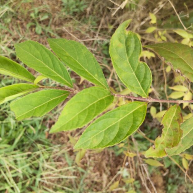 真面目すぎるほど等しいピッチできちんと生える対生の葉っぱです。 長細いだ円形で先が細くとがります。 葉の上半分にはあらいギザギザがあります。