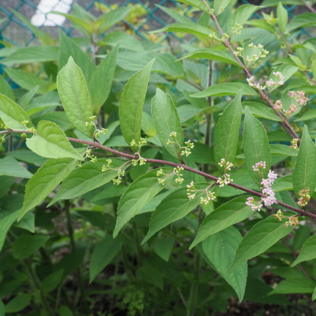 7~8月ごろ葉の付け根の少し上に、 うす紫色の花が10~20個ずつ花を咲かせます。