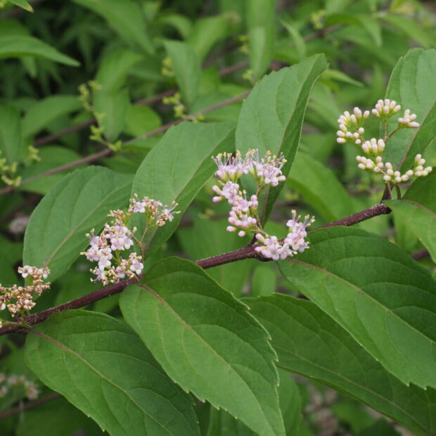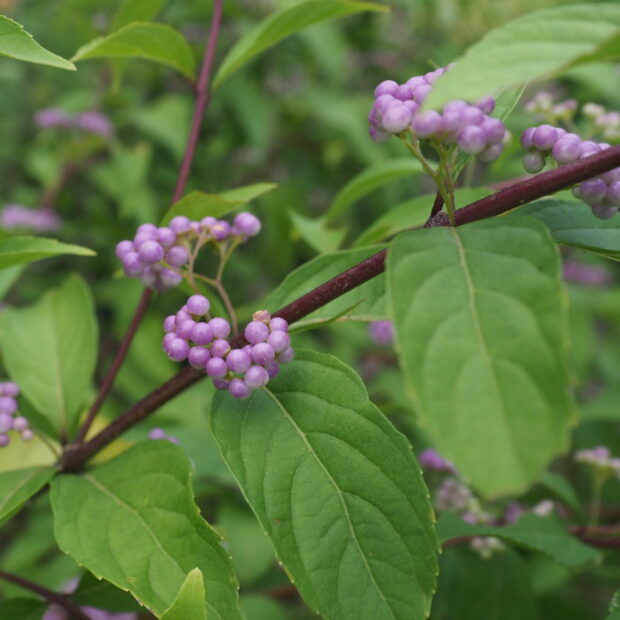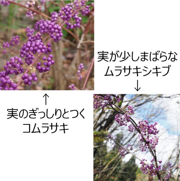 秋、 たわわに実る紫色の実は美しく、 葉っぱが落ちるとさらに目立ちます。 春に咲くうす紫色の花も可愛いです。 花や実がたくさん付いて見栄えが良いので、 庭園では「ムラサキシキブ」と言われながら植えられているコムラサキをよく目にします。