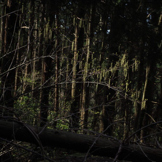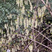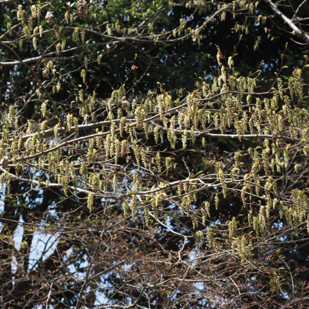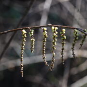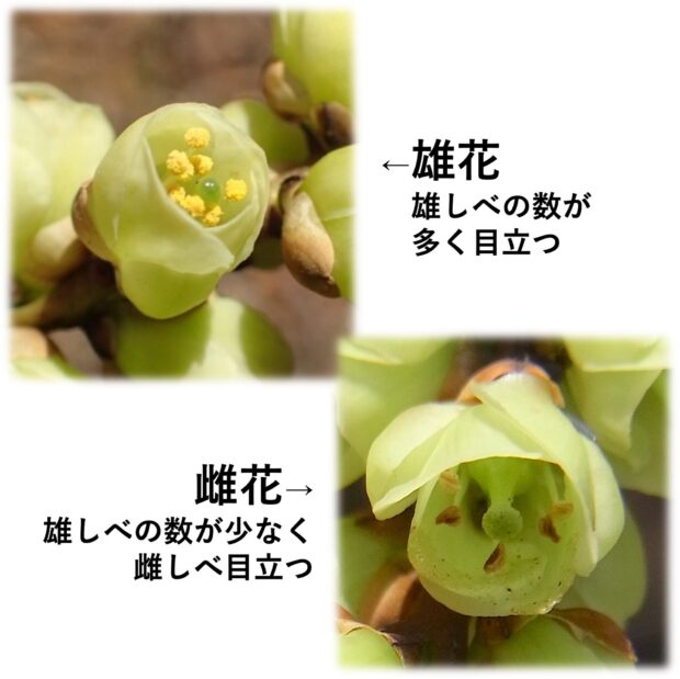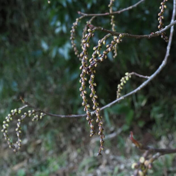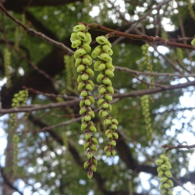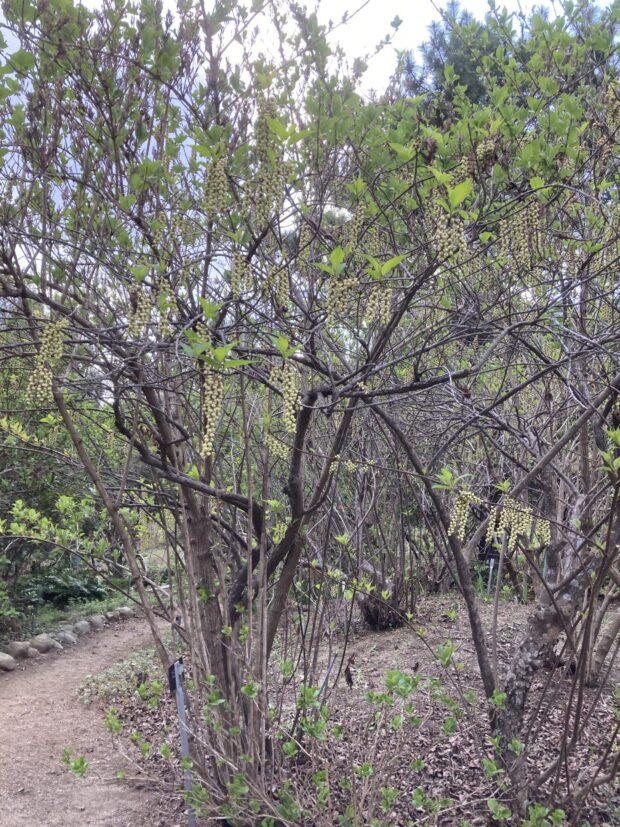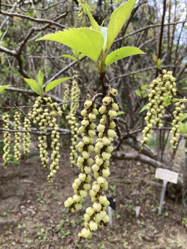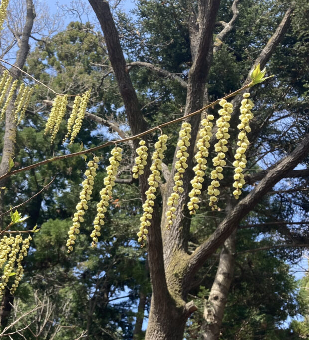 雄の木と雌の木があります。 葉が直前の3~4月頃、 枝先に房が伸び鐘形の花が房状に集まって咲きます。