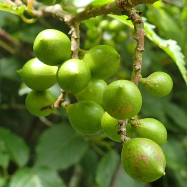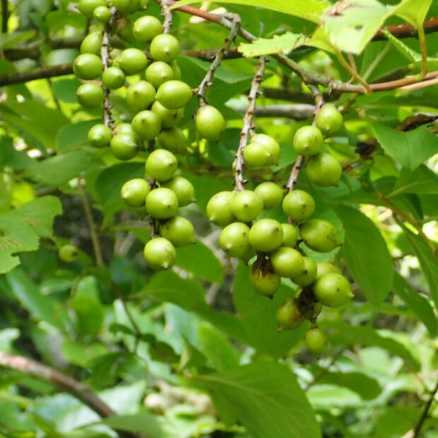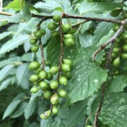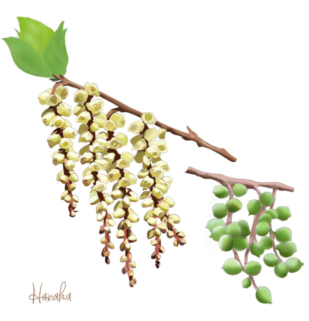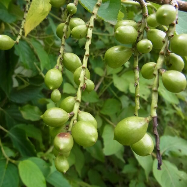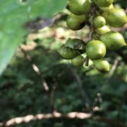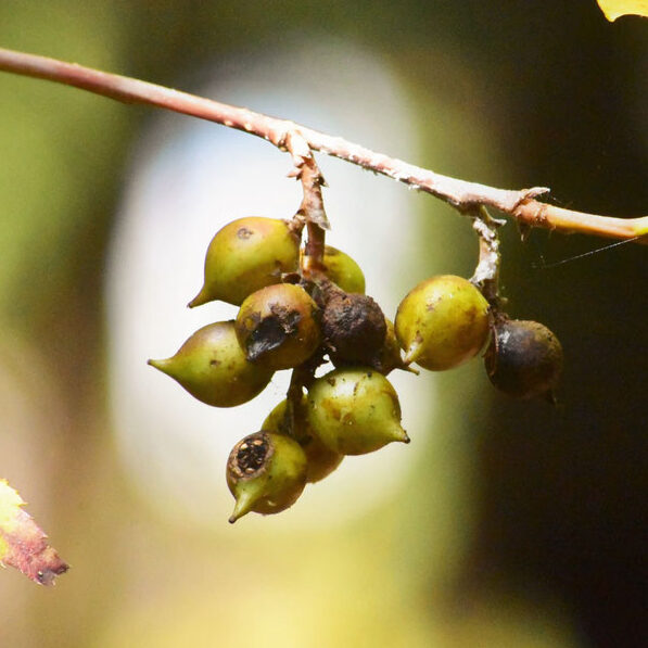 7~10月頃に実をつけます。 はじめは緑色ですが熟すと黄褐色、 最後は黒色になります。