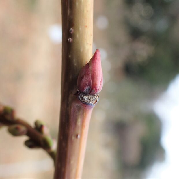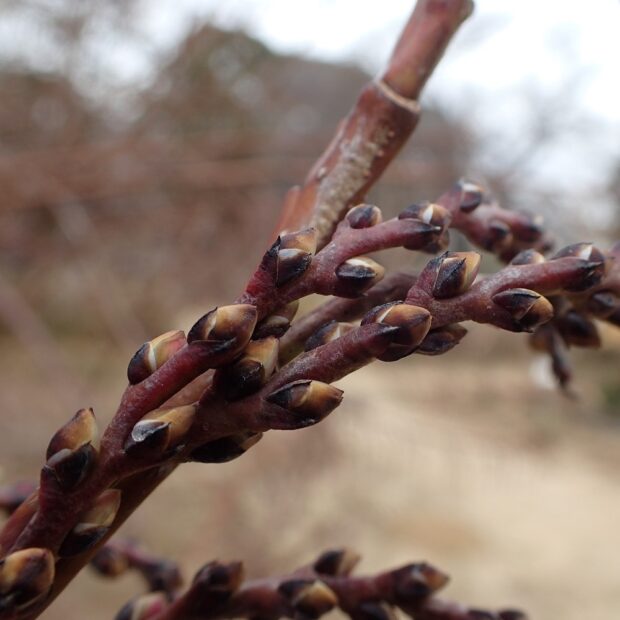 先がとがり、 2~4個の鱗(芽鱗)に包まれています。 鱗には毛はなく、 赤褐色~暗褐色です。
