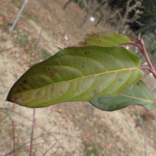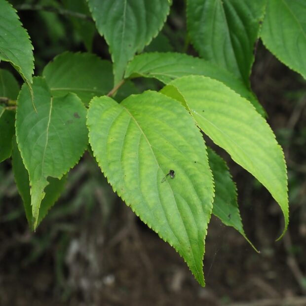 葉の長さは6~12㎝。 楕円形または卵形で先がとがります。 縁にはギザギザがあります。