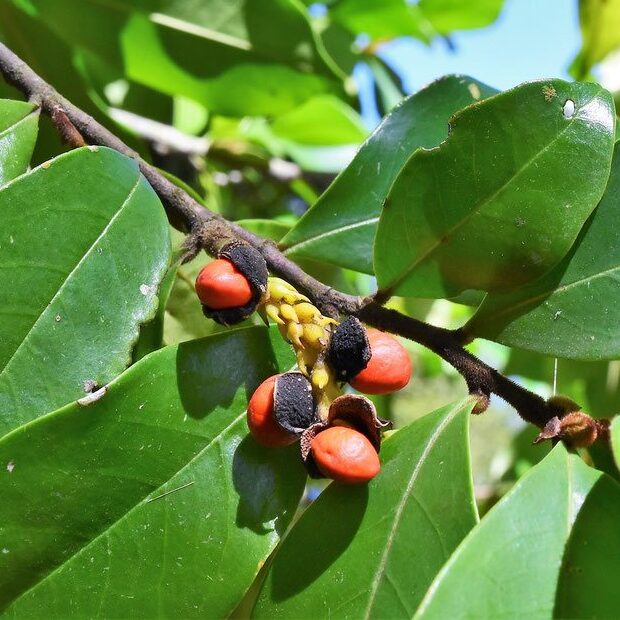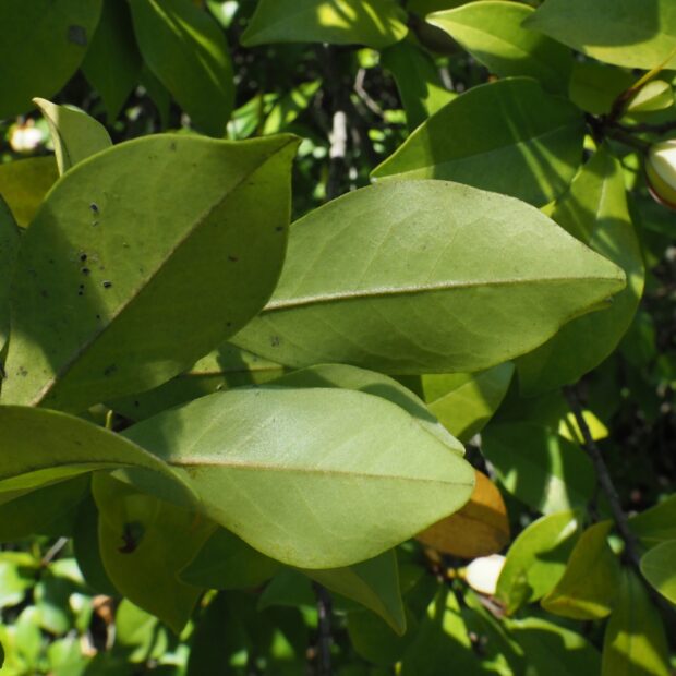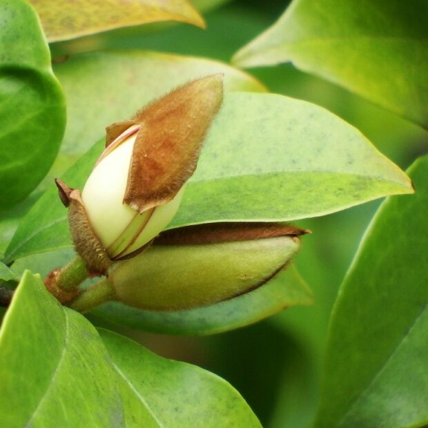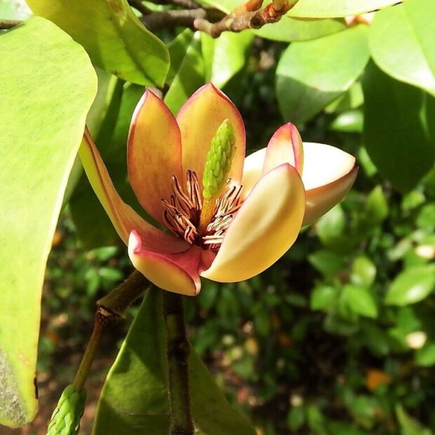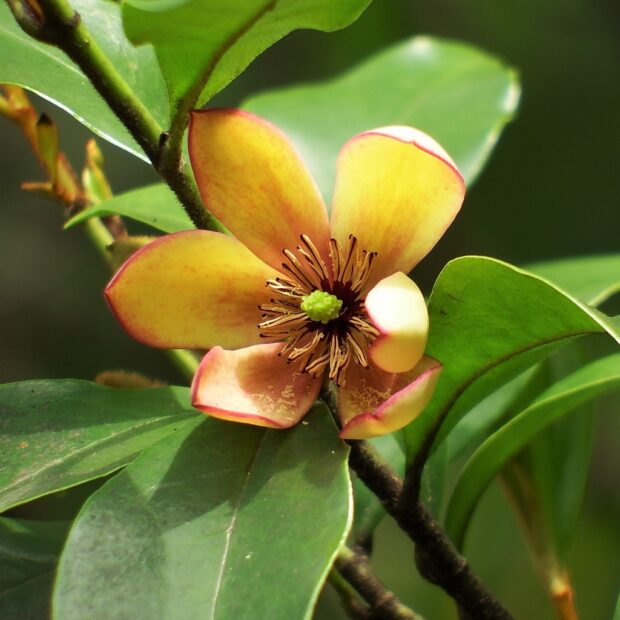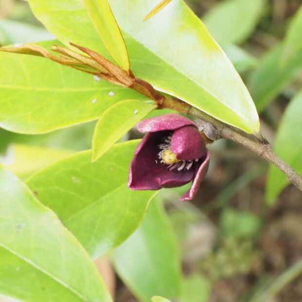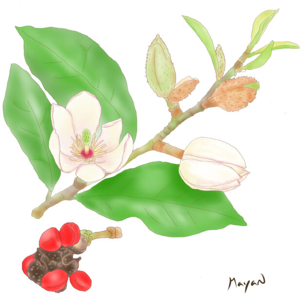 モクレンと同じ仲間で花の構造は原始的。 蜜は出さず花粉と香りで虫を引きつけます。