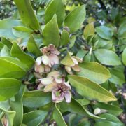 3~4月頃、 2年ほど経った枝に淡い黄色の花を咲かせます。 花はバナナやミックスジュースに似た強い香りがあります。 縁は紅色を帯びます。