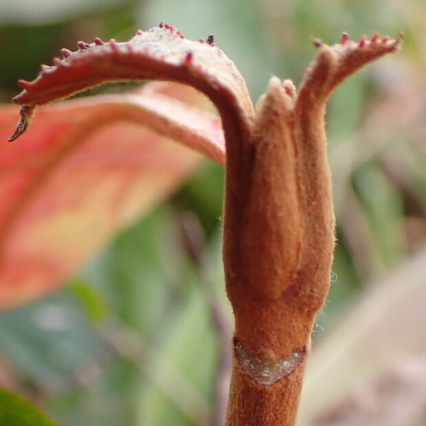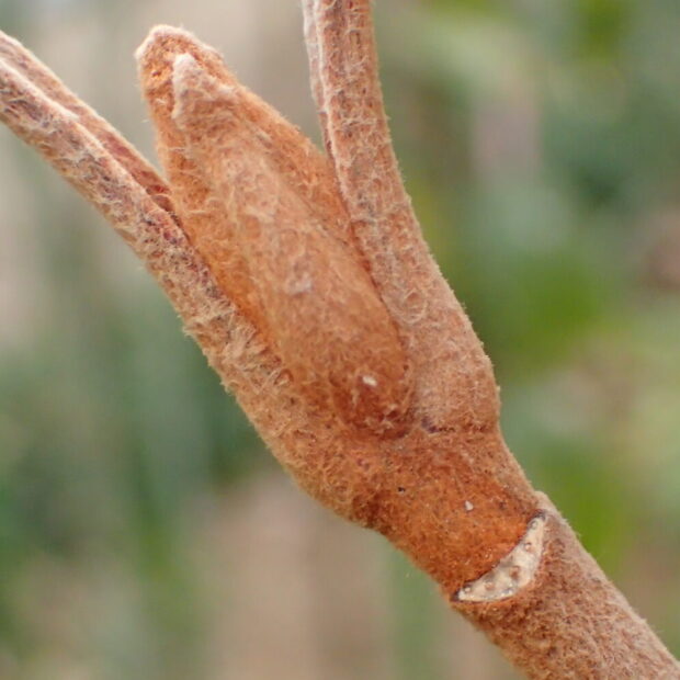 薄い赤茶色の温かそうな毛におおわれています。 葉痕は白っぽくくっきりとした形です。