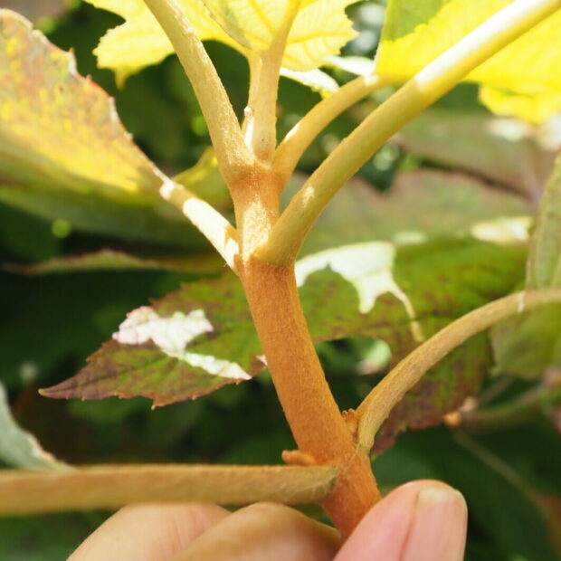 若い枝は毛があり、 白っぽい緑や赤みを帯びます。 時間が経つと、 白っぽい茶色になります。