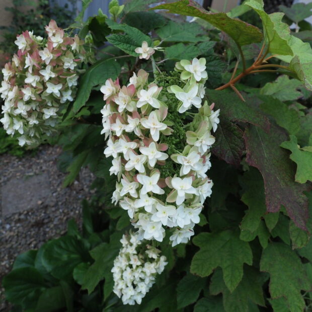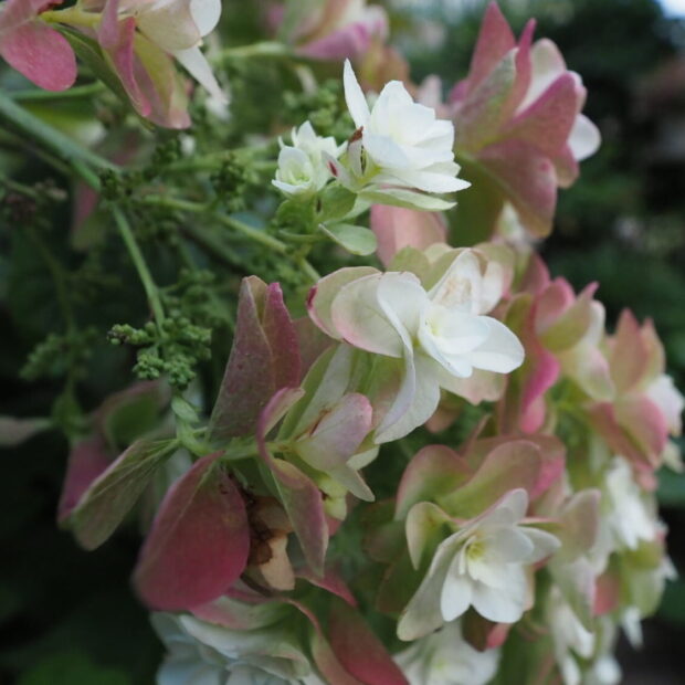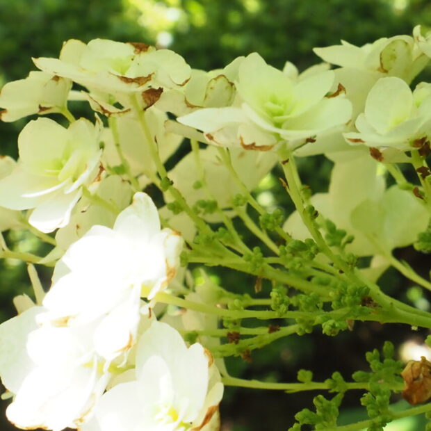 ・7月から10月に咲く日本原産のノリウツギの品種の花は、 カシワバアジサイによく似て円錐形の花房をしています。
