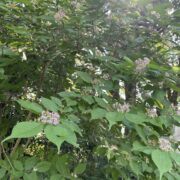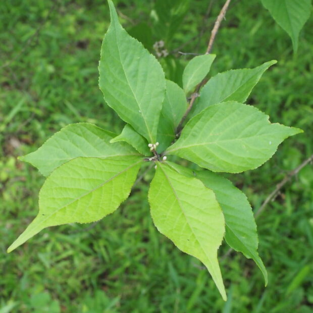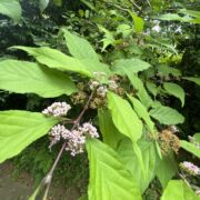葉に食べあとがあれば、 イチモンジカメノコハムシや、 蛾の幼虫(ヨスジノメイガ、 マタスジノメイガ、 マエベニノメイガ、 ムラサキシキブツツヒメハマキなど)がいるかもしれません。