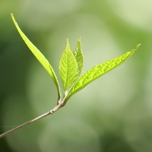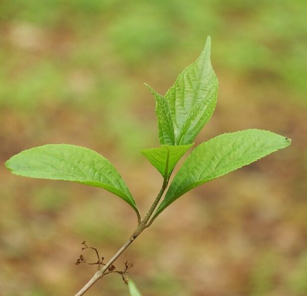 先と付け根が細くなり、 ひし形っぽい葉っぱです。 対生に付き、 ふちには細かいギザギザがあります。 大きくなった葉っぱには毛が無ありません。