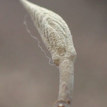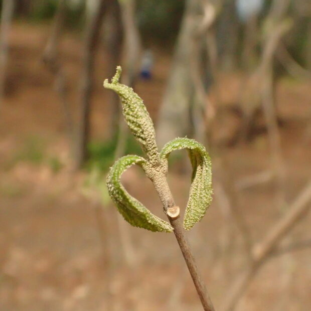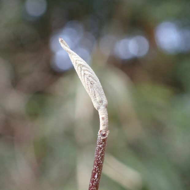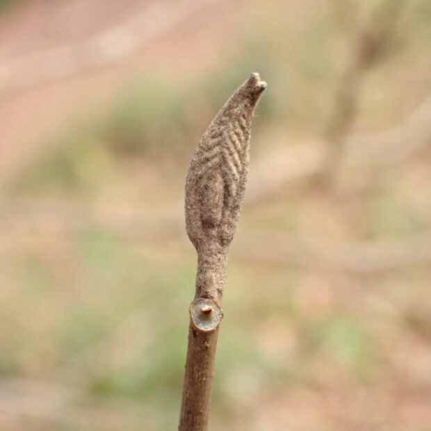 芽をおおう皮はなく、 粉のような毛のある葉がピチッととじている状態の芽です。 葉痕の維管束痕は1つで、 少し出っ張っています。 にっこりしたお口に見えます。