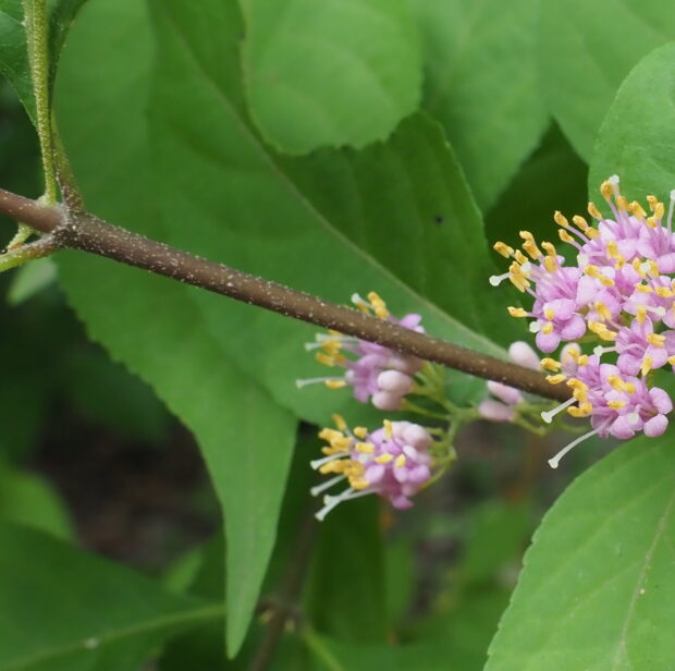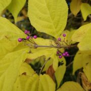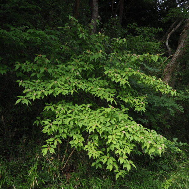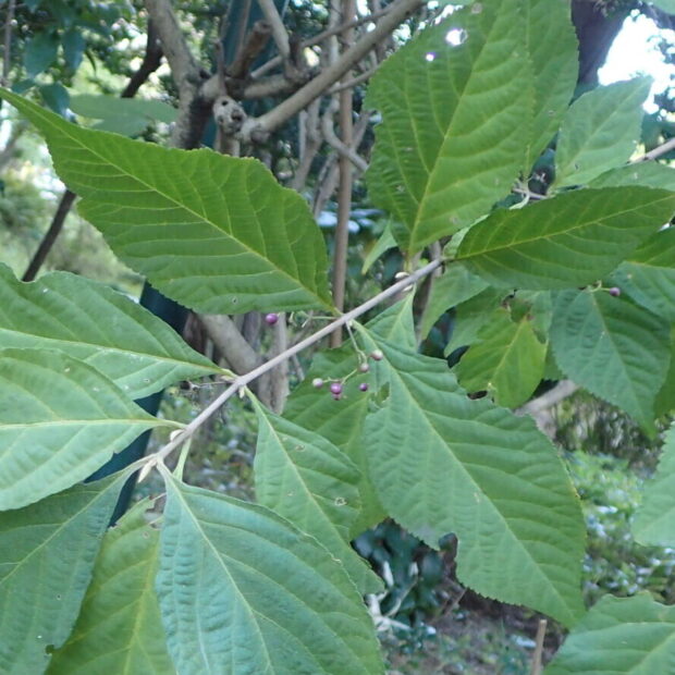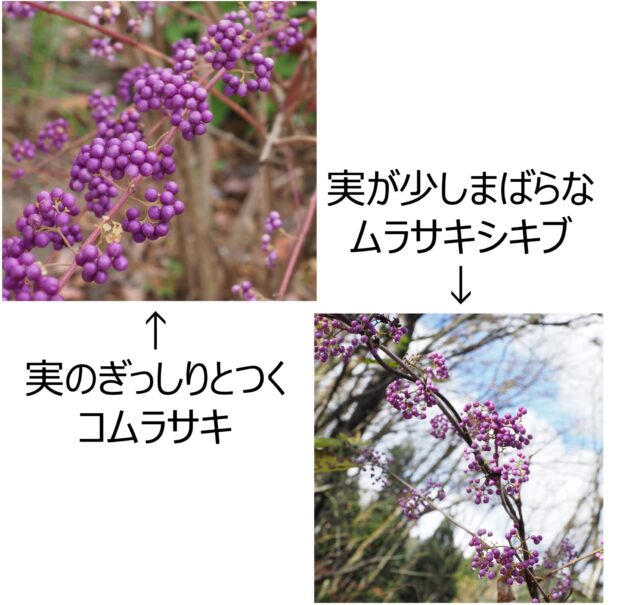 植栽されているのは、 実の付きが良いコムラサキが多く、 一方自然の森でみかけるのはムラサキシキブが多いです。
