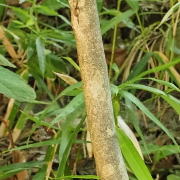 コムラサキをムラサキシキブと思っていた人が森のムラサキシキブを見たら、 雰囲気が違います。 なんていうか、 可愛い雰囲気ではなくて、 大きくて強いイメージ。 紫の実もまばらで、 少なめ。 まるで紫式部がガチで執筆活動をしていて、 なりふり構ってない様相です。 コムラサキと違い、 まるで「筆」のような冬芽を見ると、 「ああ、 これが本物のムラサキシキブだ」と思います。 こんな筆で源氏物語を書いたんではないかと想像してみても楽しいですよ。