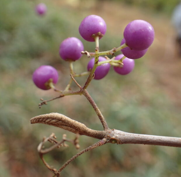 3~4mmの紫色の丸い実。 秋から冬にかけて陽の光にキラキラ光ってよく目立ち、 秋の森の中を素敵に演出してくれます。 実の中には2㎜くらいの種があります。