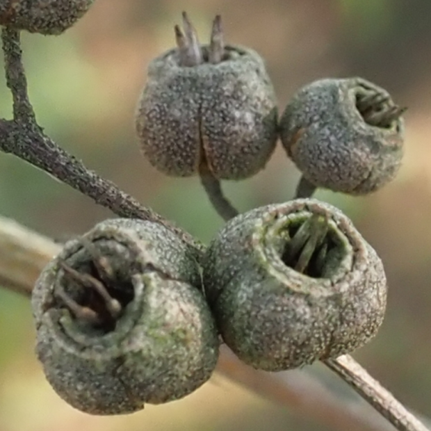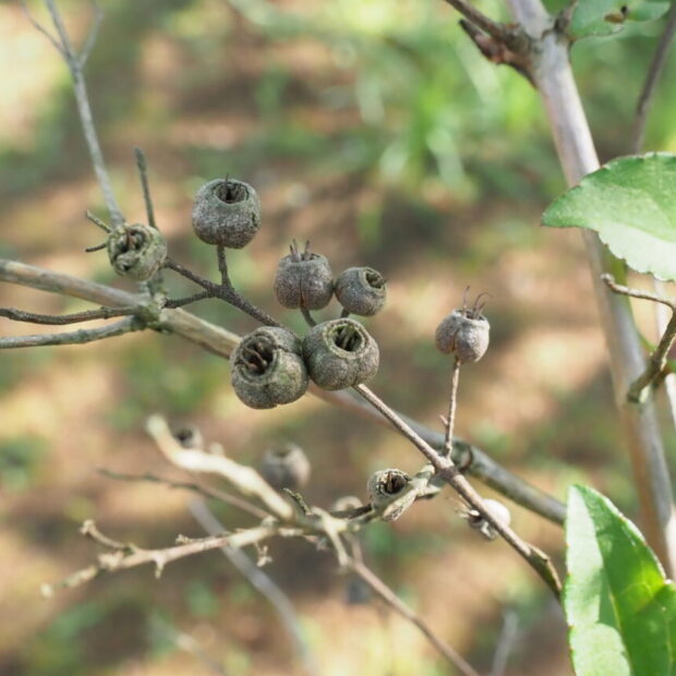 灰褐色で短冊状にはがれます。 枝は暗褐色で若い枝は赤茶色で毛があります。