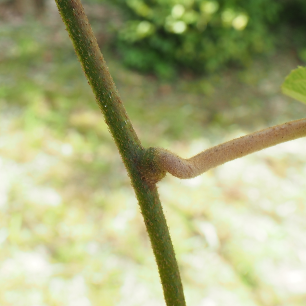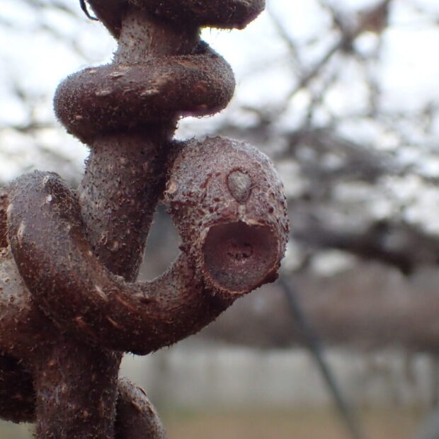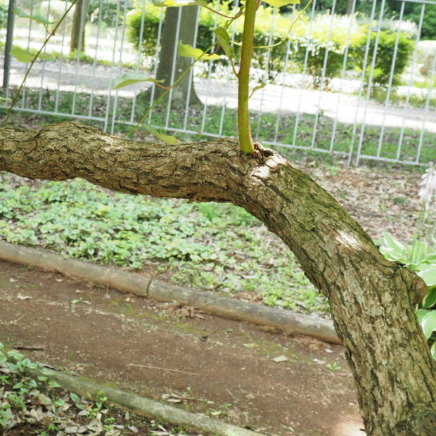 新しいツルは褐色の毛でおおわれています。 数年たつと木質化した太いツルになります。