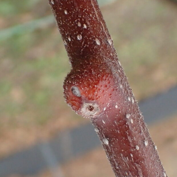 赤茶色のつる状の枝からポッコリと飛び出したところに、 ポチッと小さな冬芽と、 丸くくぼんだ葉痕があります。