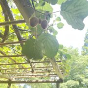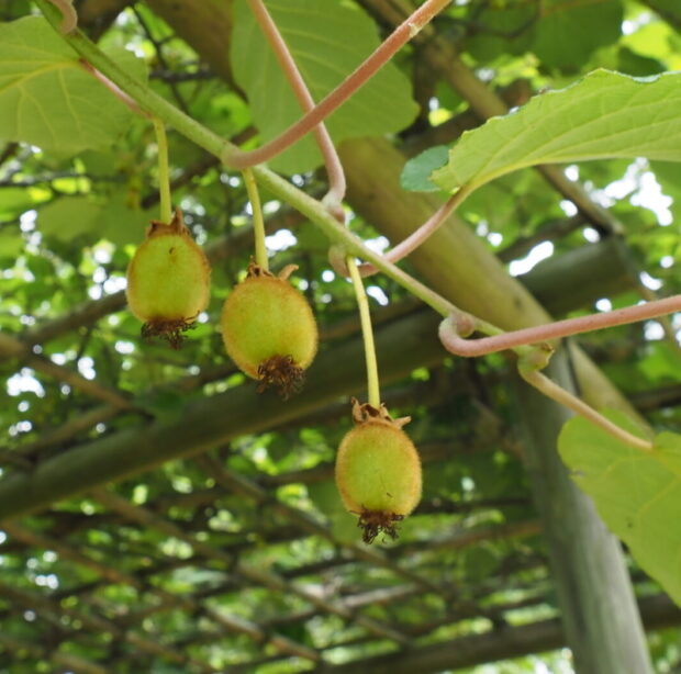 ツル性なので、 棚で栽培されます。 雌雄別々の木なので、 実を採るために雄の木と雌の木を一緒の棚で育てます。