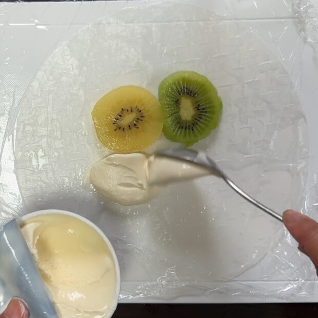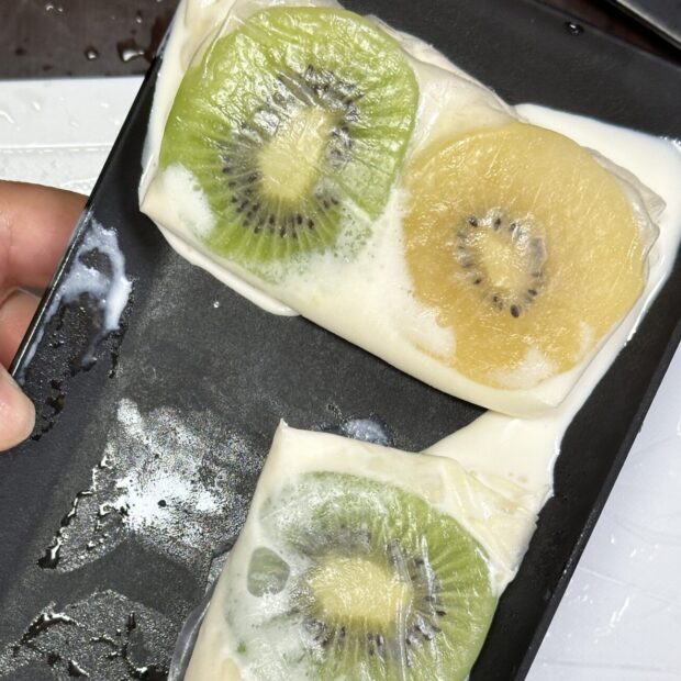 ライスペーパーでアイスとキウイをくるんだ簡単なおやつ。 もちもちひんやりおいしいですが、 急いで作らないとアイスが溶けちゃいます。 作ったものをラップでくるみ、 急速冷凍すると後でゆっくり食べられます。