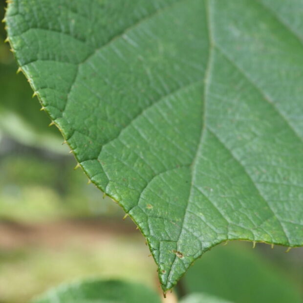 葉は交互に並びます。 厚みのある丈夫な葉っぱで、 葉の裏に毛がたくさんあります。 葉の柄は3~10㎝と幅があり、 場所によって長さに違いがあります。