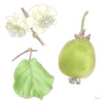 初夏、 クリーム色の花が咲きます。 雌花にはたくさんのめしべがあります。 雄花には退化しためしべがあるため、 雌花と雄花は似ています。 雄の花は咲き終わると落ちます。