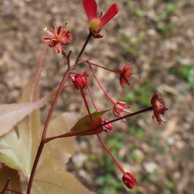 4~5月の芽吹きの時期に小さな赤い花が集まって咲きます。