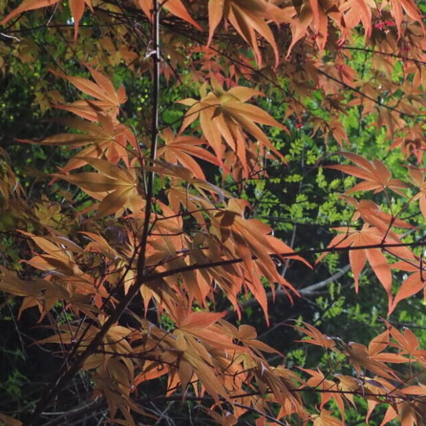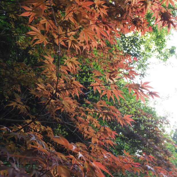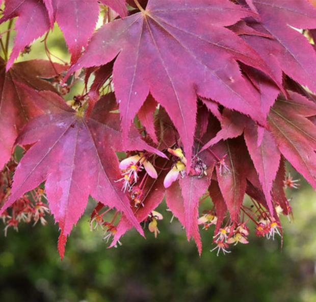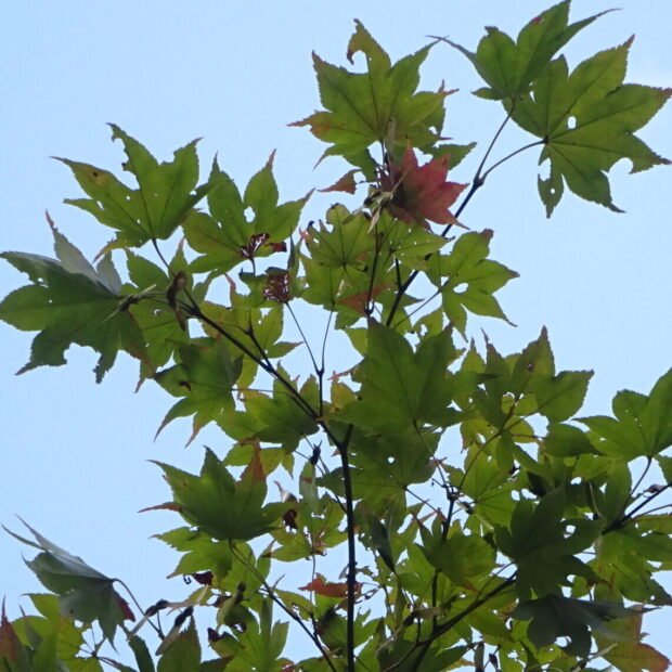 イロハモミジやオオモミジの紅バージョンです。 手の平状にさけた葉っぱは縁に細かいギザギザがあります。