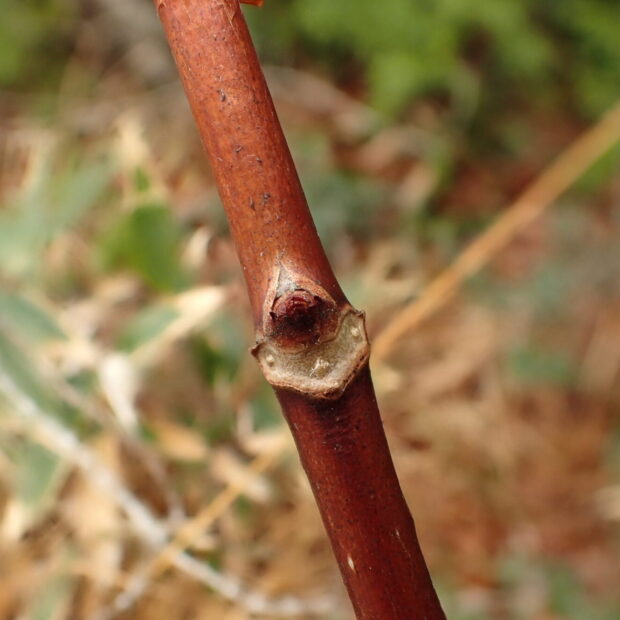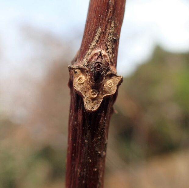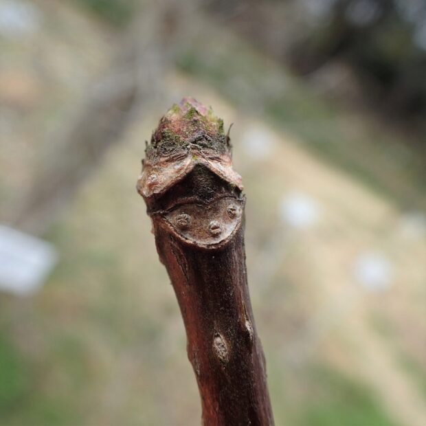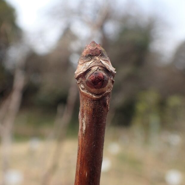 先がとがった円錐形の芽。 枝先より下の芽は、 背中合わせに2つ、 または3つ、 枝にぐるりとつきます。 葉痕の維管束痕は3つ。 お顔の表情はいろいろです。