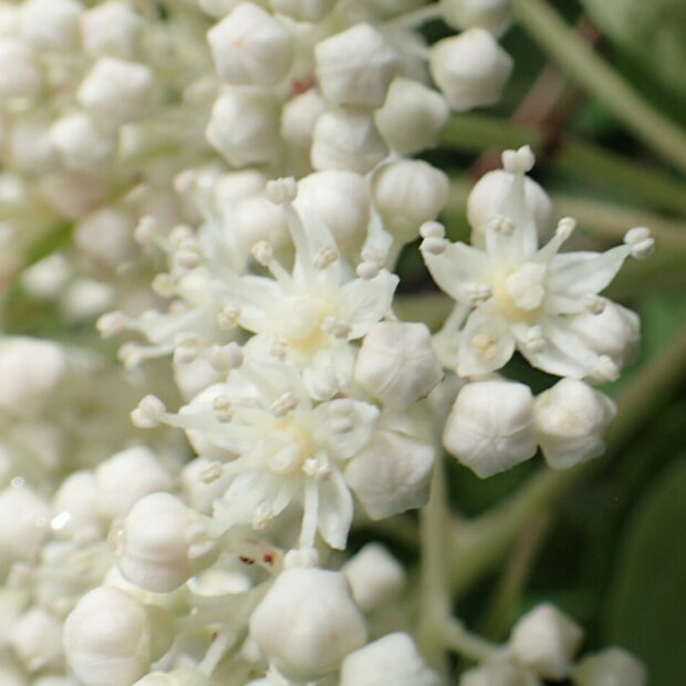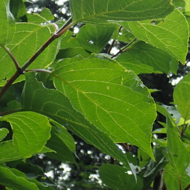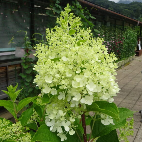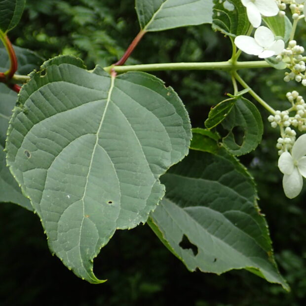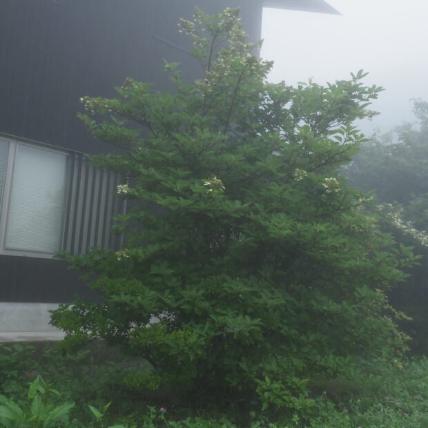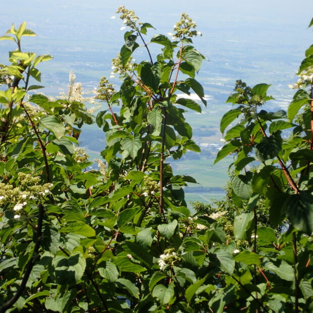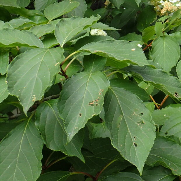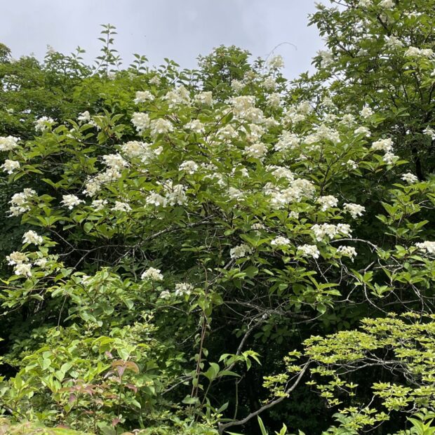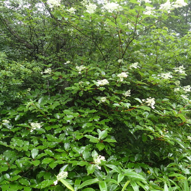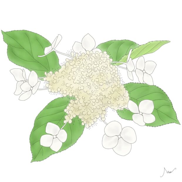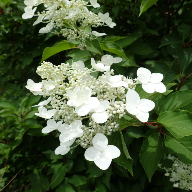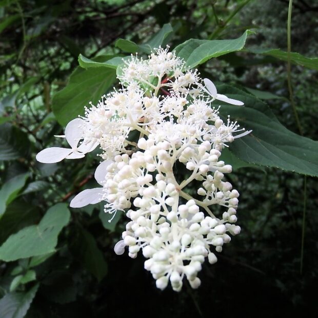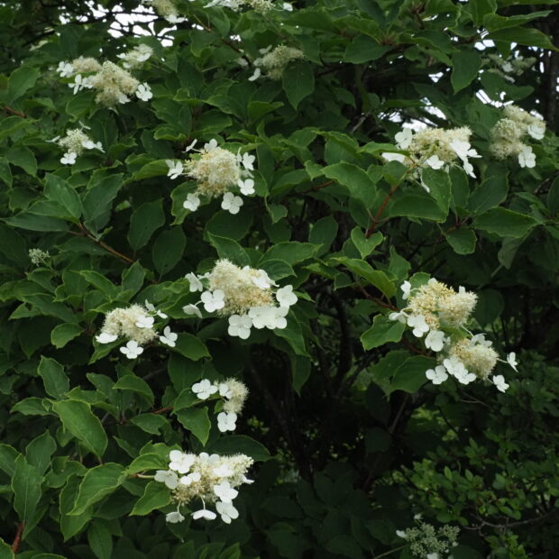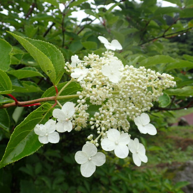 夏から秋にかけて枝先に白い花が咲きます。 装飾花という目立つ「がく」を付けた花と、 そうでない花が集まってピラミッドの形を作ります。