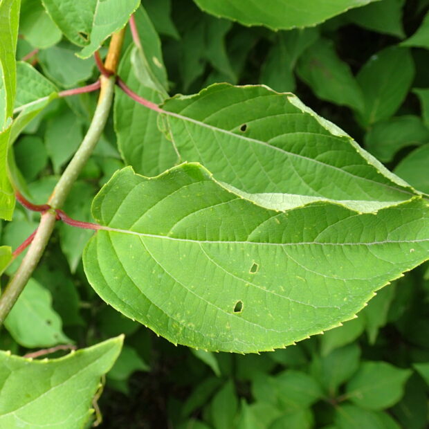 楕円形で細かいギザギザがありますが、 葉によって形にバラツキがあります。 対生に付き、 3cm程度の赤味を帯びた長目の葉柄が特徴です。