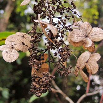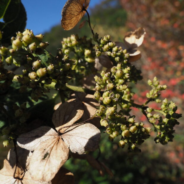 小さな実は秋に熟して茶色や赤褐色になります。 装飾花も茶色くなって残ります。
