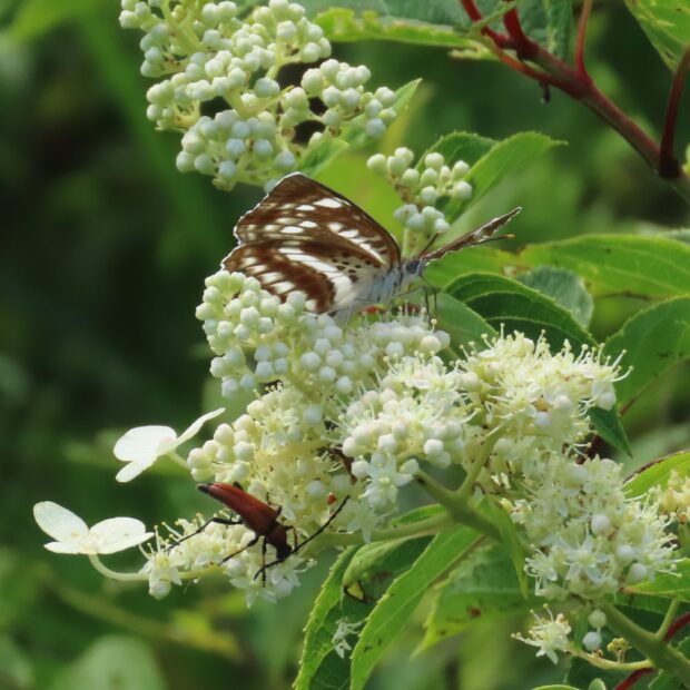 • チョウ(ホシミスジ)やカミキリムシ(アカハナカミキリ)も花にやって来る。