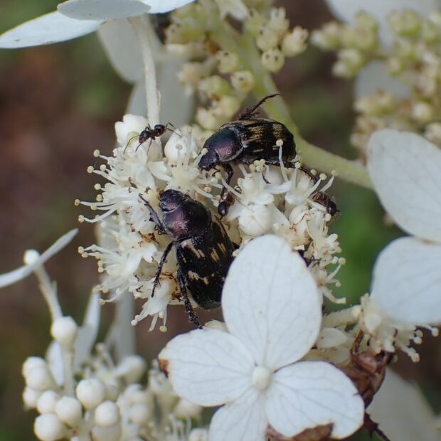 • セマダラコガネが花に群がる。