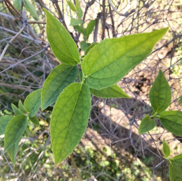 葉っぱの付け根から長~く伸びる3本の葉脈が特徴です。 縁には小さなギザギザがまばらに付きますが、 全く無い葉っぱもあります。