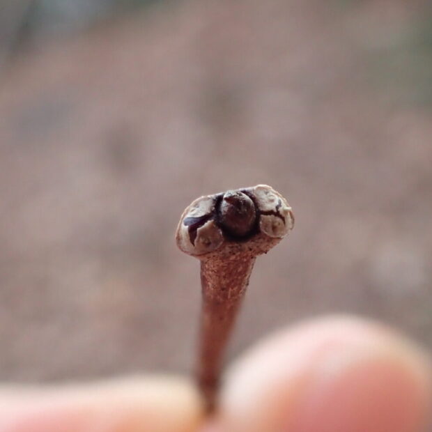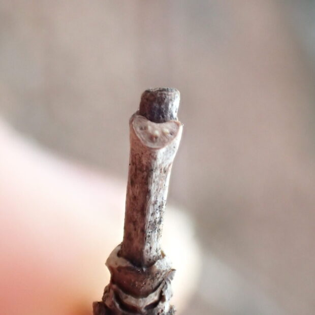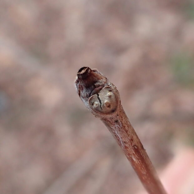 とんがり帽子のような冬芽は見えず、 葉がもともとついていたところ(葉痕)の中にかくれています。 葉痕には維管束痕が3つあってお顔に見えるのですが、 芽がでてくるときにはお顔が割れてしまいます。