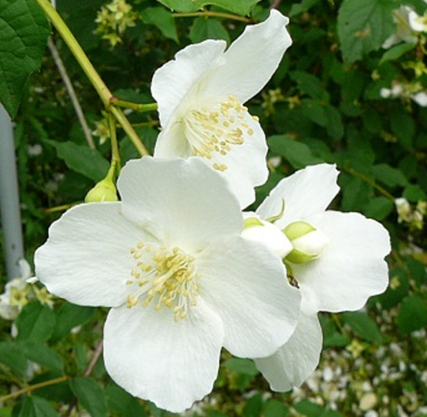 6月ごろに良い香りのする白い花が咲きます。 花びらが4枚で20本くらいの黄色い雄しべが付きます。