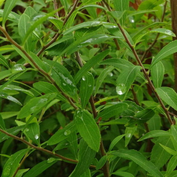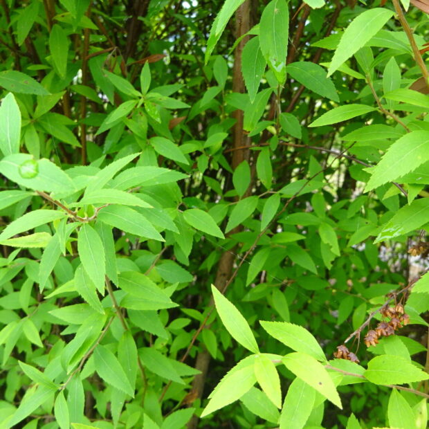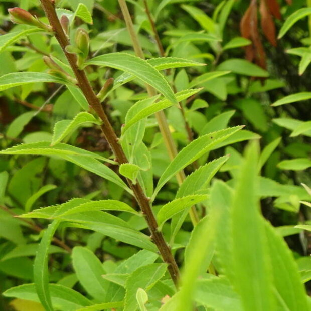 細長い葉っぱが交互に枝に付きます。 葉のくきがほとんど無く、 ふちに小さなギザギザがあります。