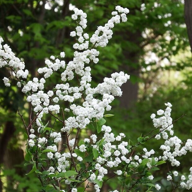 シジミバナはそっくりな樹形で白い花ですが、 八重咲きの種類です。