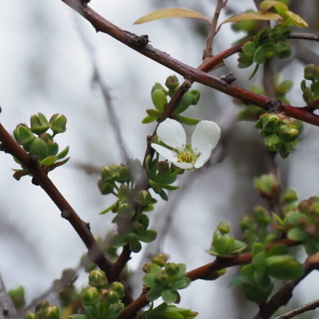 春、 街中で雪のように健気で白い花を咲かせる木ですが、 もともとは川岸の岩場に生え、 大雨のだく流に飲まれても負けずに生き続ける強い木です。