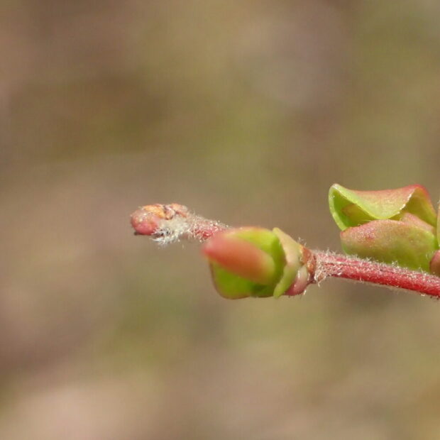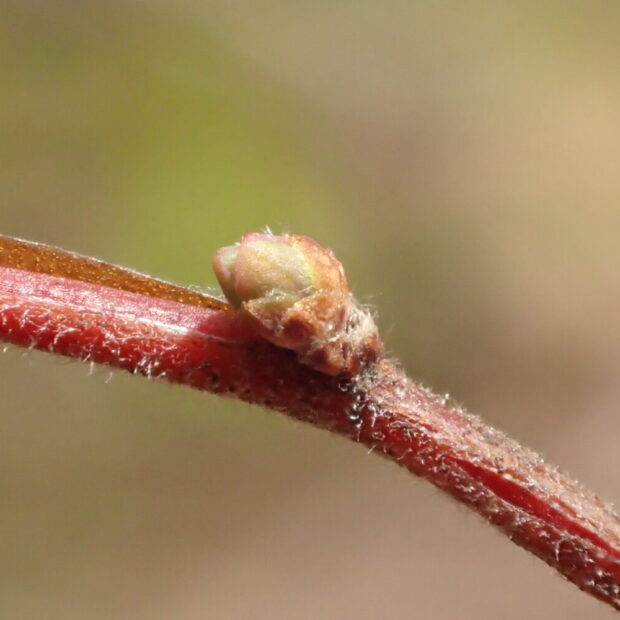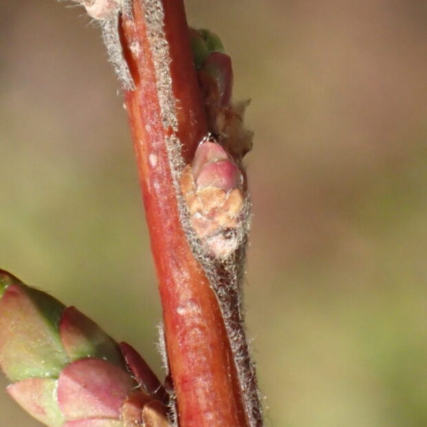 赤くて細く枝垂れる枝につく冬芽はとても小さなものです。 よく見ると、 何枚かの赤い芽鱗や細かい毛があることがわかります。