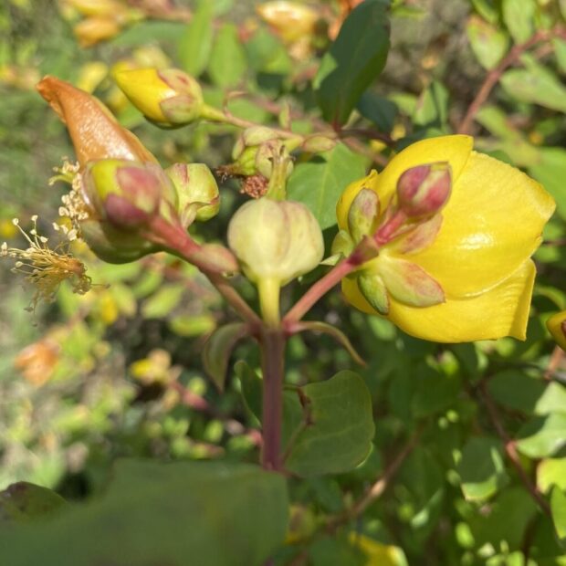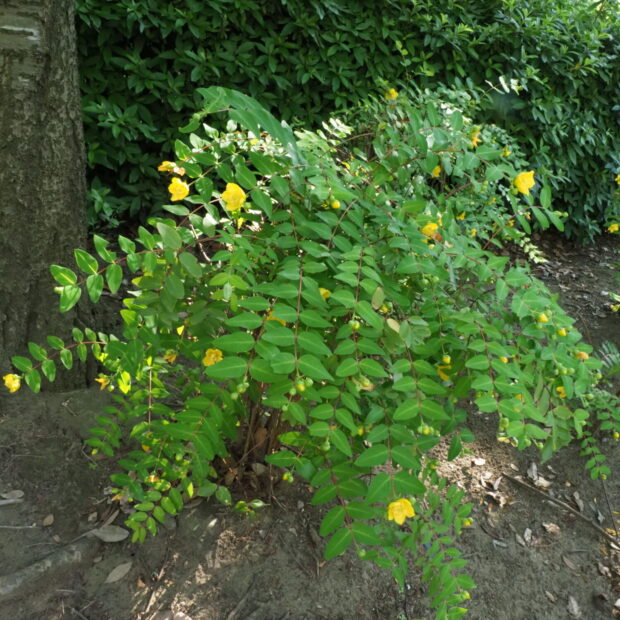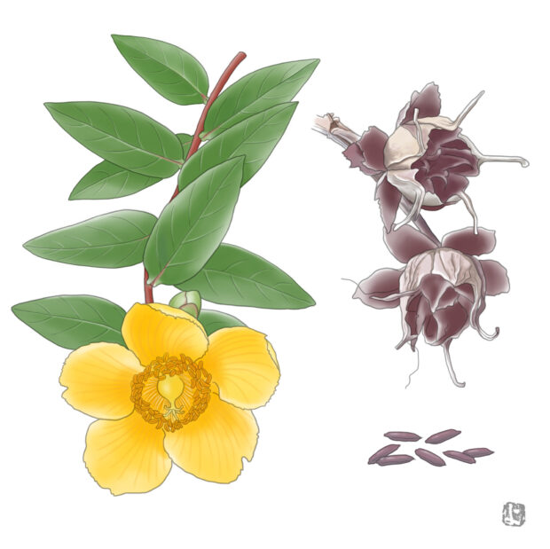 6~7月の梅雨の時期に、 たくさんの雄しべを持った黄色い花が咲きます。 5枚ある花弁は厚手で光沢があり、 少しすぼみ気味で開きます。