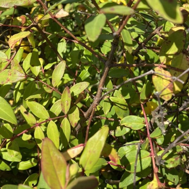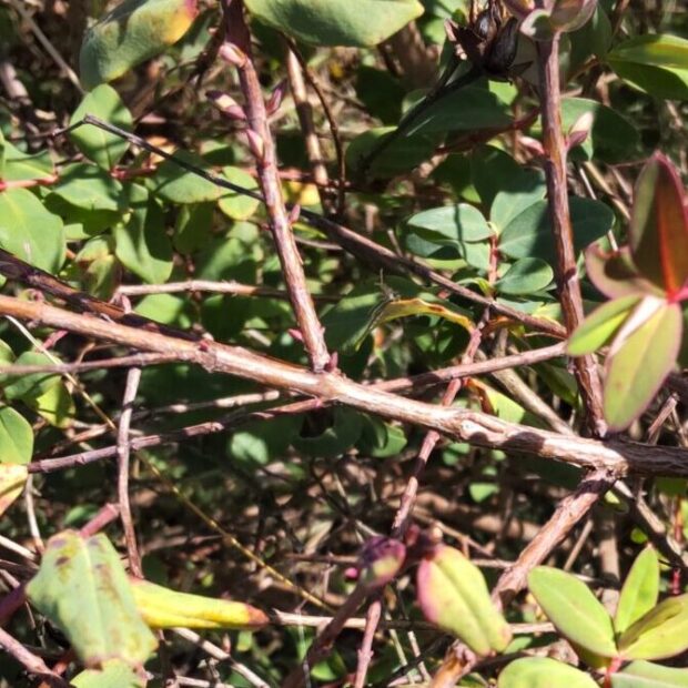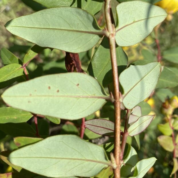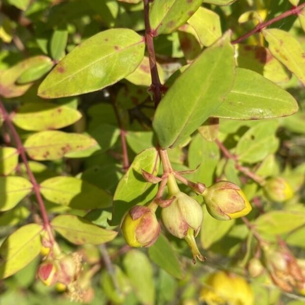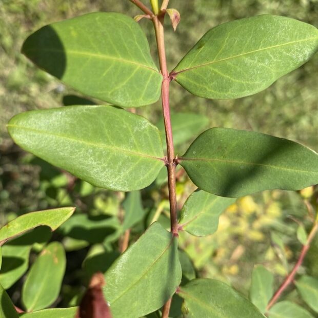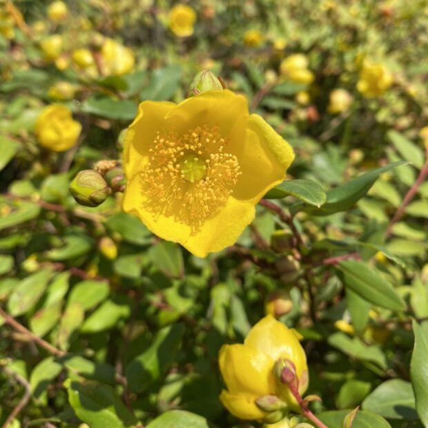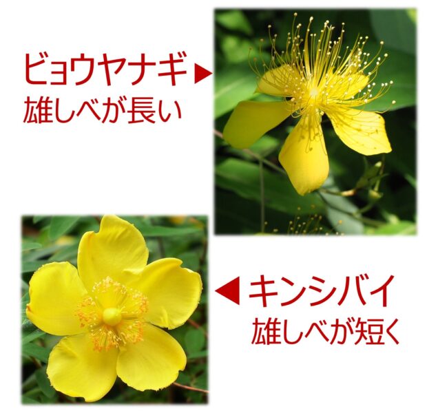 キンシバイとビョウヤナギは似ていますが、 ビョウヤナギの方が葉も花も大きいです。 雄しべの長さもビョウヤナギの方が、 花弁から飛び出るほど長いです。