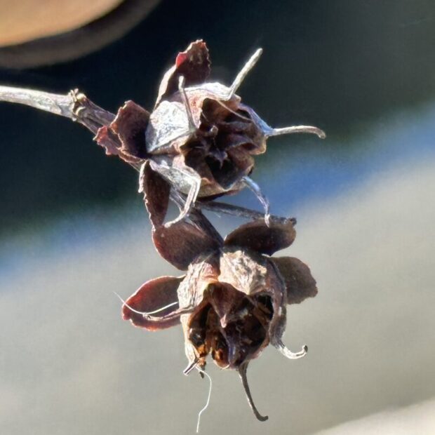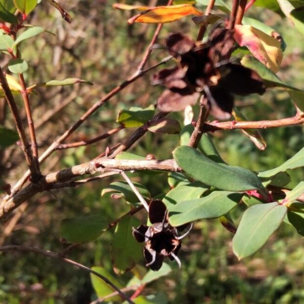 10月ごろ、 熟してこげ茶色になる実を付けます。 熟した実は5つにさけて、 小さな種がこぼれ落ちます。