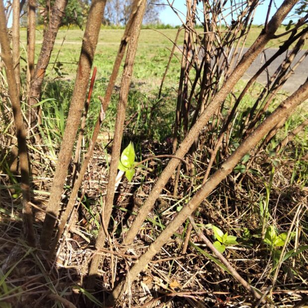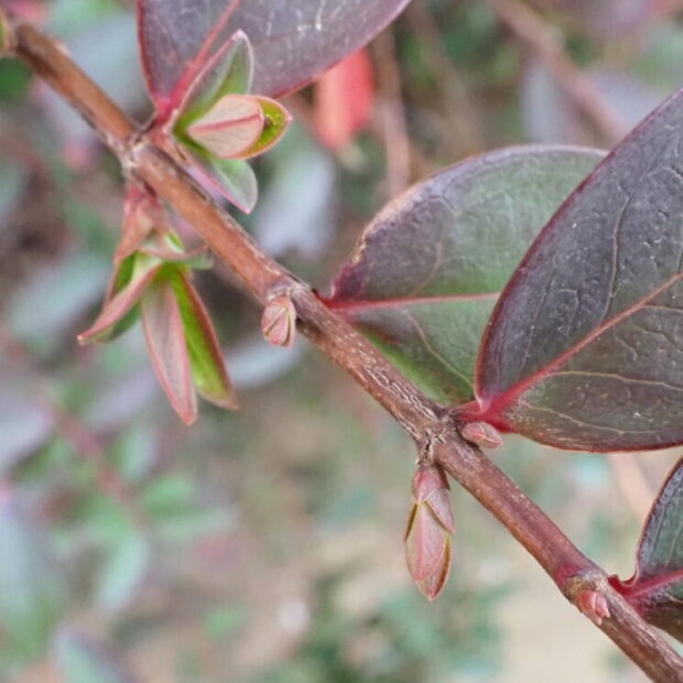 赤味がかった小さな冬芽が枝の側面にたくさん付きます。