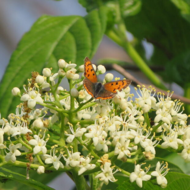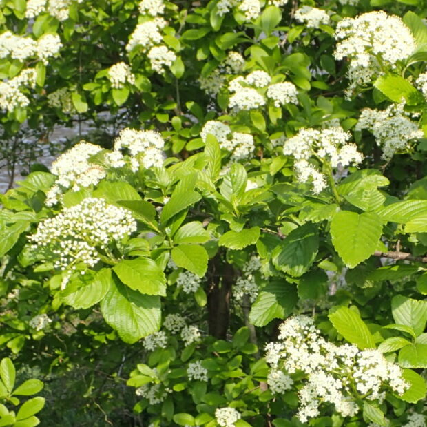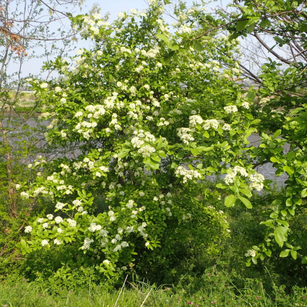 ガマズミの仲間で、 日本にだけ自然に生えている日本固有種です。 葉をもむとゴマの香りがします。 春に白くて小さな花をたくさんつけ、 夏に実る赤い実もとても目立ちます。