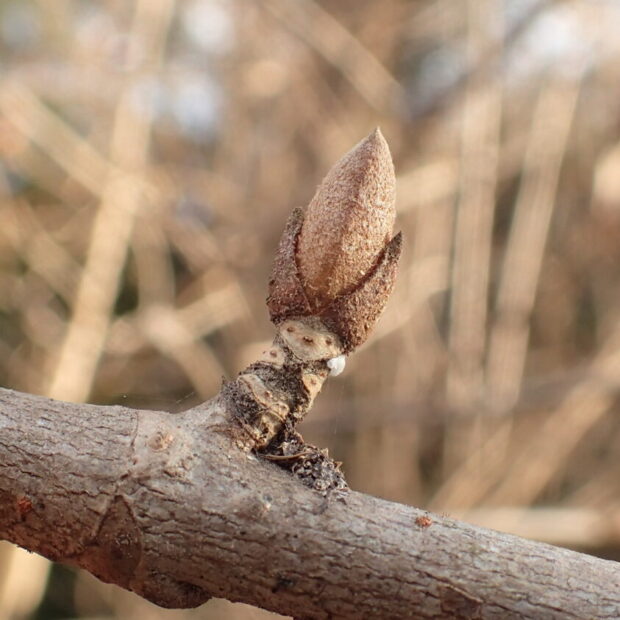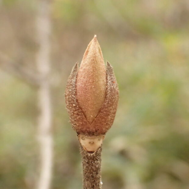 冬芽を包む芽鱗は4枚あって、 左右対称にきっちりと並んでいます。 外側の2枚は早くに落ちますが、 内側の2枚には毛があって大切に芽を守ります。 葉痕の維管束痕は3つで、 お顔がはっきりしています。
