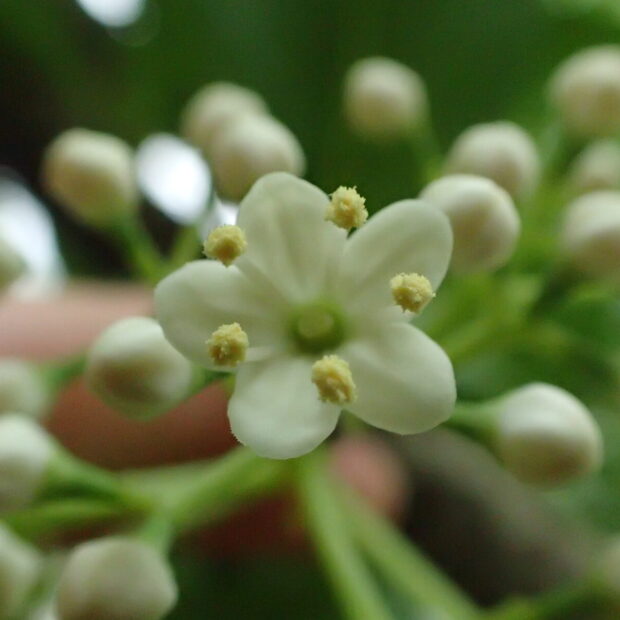 小さな白い花をたくさんつけます。 花びらは5枚で雄しべも5本です。 枝先にピラミッド型につき、 真ん中の方から順々に咲いていきます。